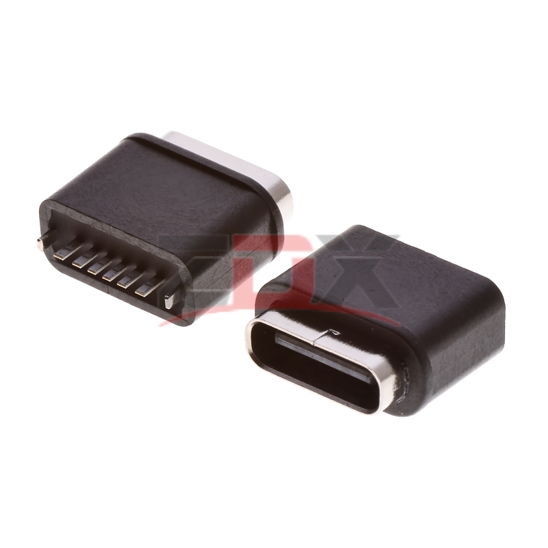 立贴24P防水母座;防水等级IPX7;粉末冶金外壳长度L=6.68-7.50MM;单圈和双圈六个小固定插脚配红色防水圈;寿命1万次。